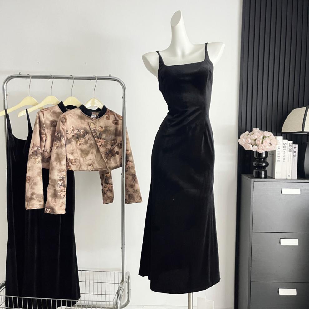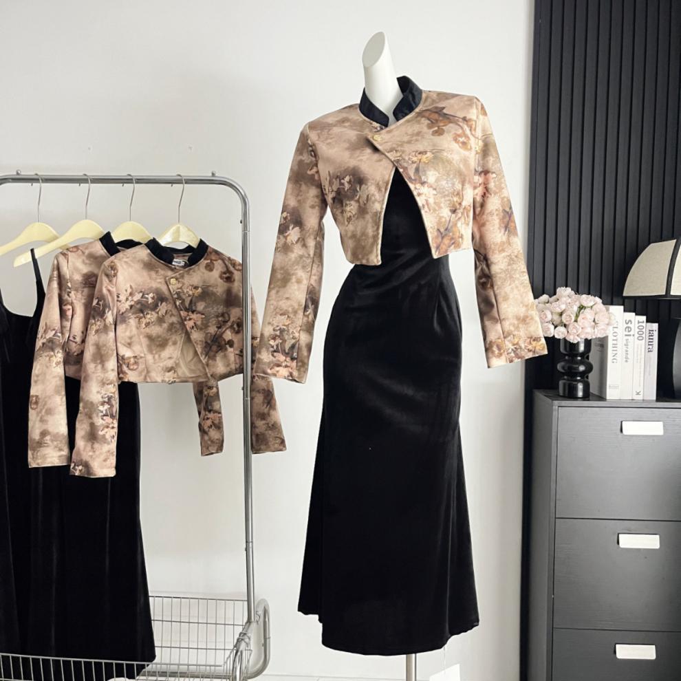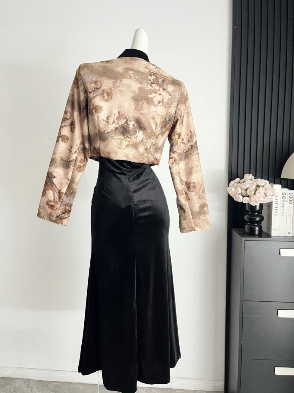 Embrace timeless elegance with this mid-length artistic ensemble, combining a long-sleeve top and matching dress crafted from premium polyester fiber. Inspired by Chinese-style aesthetics, the set features intricate printed patchwork that evokes vintage artistry and refined sophistication. Slight stretch ensures comfort, while the regular sleeves and mid-length skirt create a graceful, flattering silhouette.